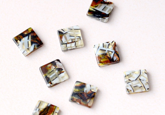 グレーやブラウンがランダムに混ざり合い、アセテートならではの複雑な模様を見て楽しめます。